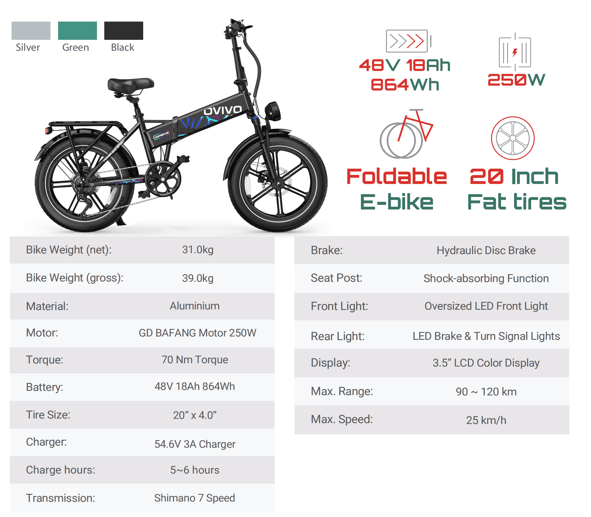 OVIVO HYPER V2 is a foldable electric mountain bike equipped with a 250 W brushless motor and a removable 48 V 18 Ah lithium-ion battery. It performs exceptionally well off-road, in mountainous terrain, and on beaches. In accordance with EU regulations, the maximum speed of the bike is 25 km/h. In pedal-assist mode, a full charge provides a range of up to 120 km.