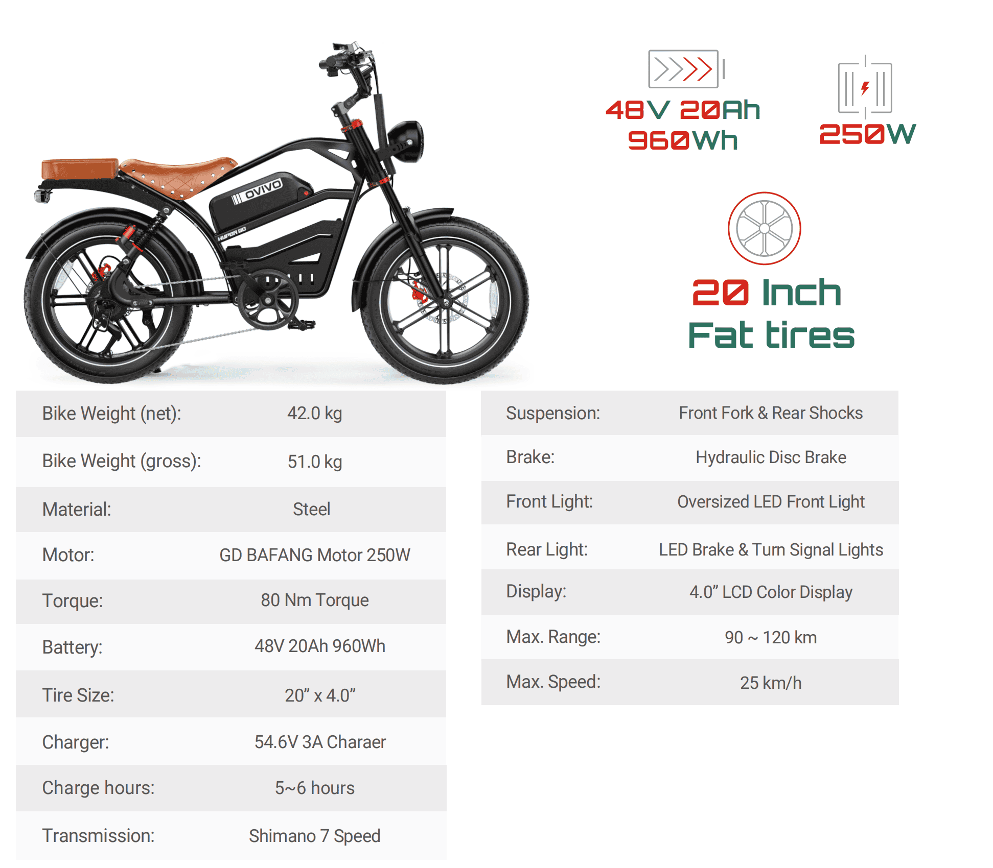 The OVIVO HYPER GO electric bike has been designed with exceptional performance in varied terrain in mind. Powered by a robust 250 W motor and a 48 V 20 Ah battery, it provides significant power and extended range. The dual suspension system and thick 20″ x 4.0″ tires enhance stability and comfort, ensuring a smooth ride on various surfaces. Equipped with hydraulic disc brakes and a 7-speed Shimano gear system, the HYPER GO offers precise control and reliable braking power, making it ideal for both city commutes and off-road adventures.